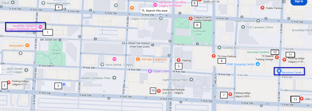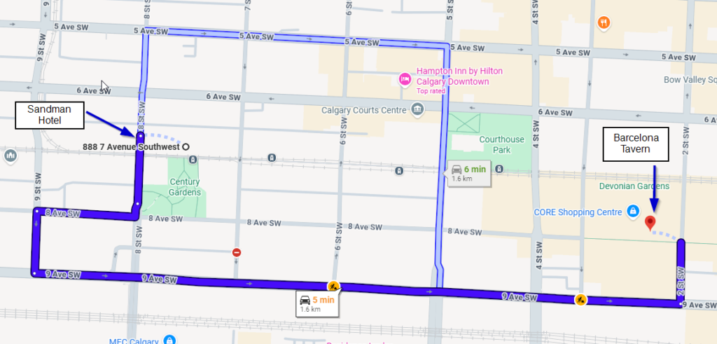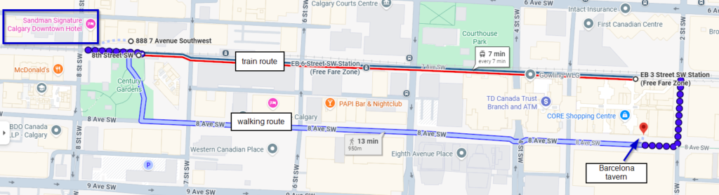 Directions from Sandman Hotel (888 – 7th Avenue SW) to Barcelona Tavern (501 8 Ave SW)